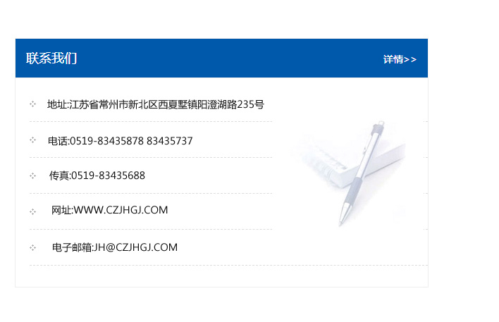傳真:0519-83435688    郵編:213135    網址:WWW.czjhgj_com.360yibang.com    電子郵箱:JH@czjhgj_com.360yibang.com